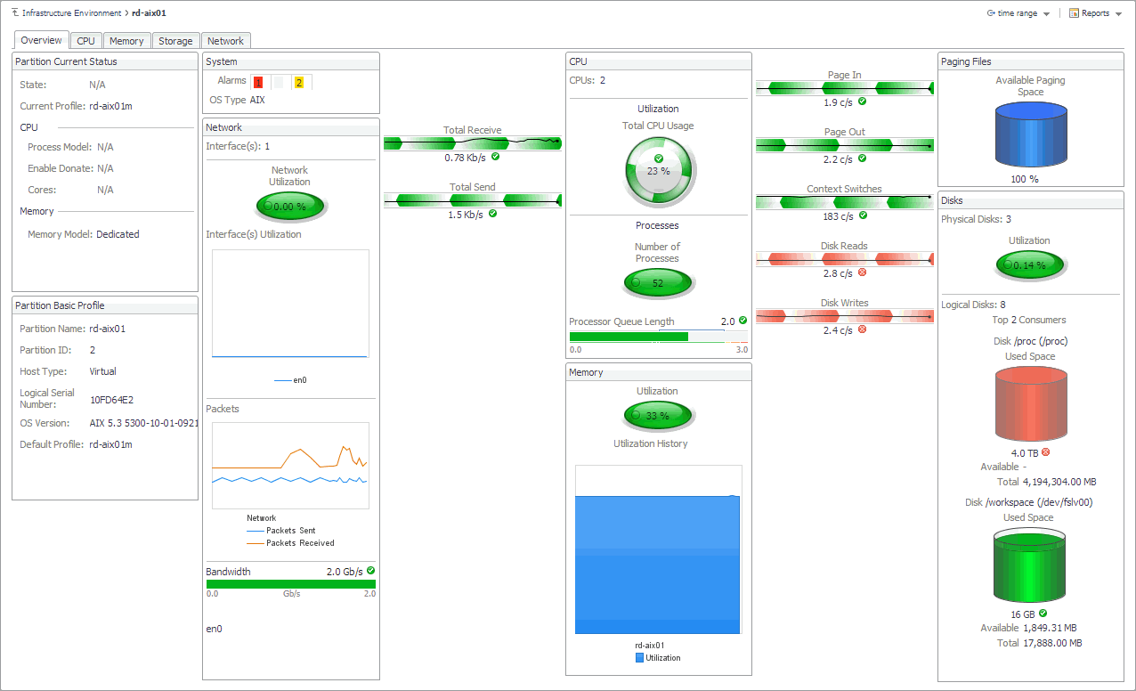 The Overview tab appears open when you explore a PowerVM® partition or a PowerVM VIOS for the first time. It displays the state of the partition's processor, memory, disk, and network resources. These visual elements are connected with graphical flows that illustrate the flow of data in real time. For example, you can review the rates of incoming and outgoing network data.