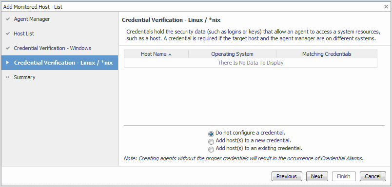 On the Credential Verification - Linux / *nix page that appears, start specifying the credentials for your UNIX® hosts. For instructions, refer to Step 5.