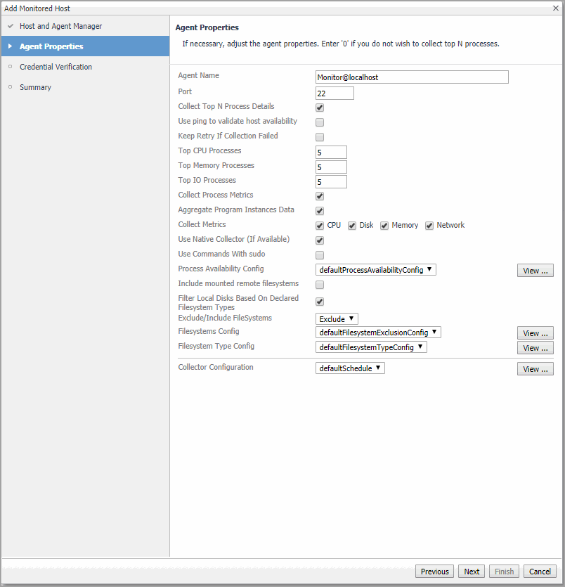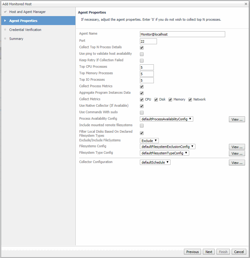 If the host name passes the validation test, the Add Monitored Host wizard refreshes, showing the Agent Properties page. The layout of the page is different for WindowsAgents and UnixAgents.