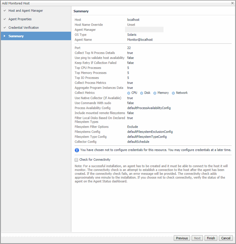 On the Summary page, review the information provided about the hosts you want to monitor and their credentials.