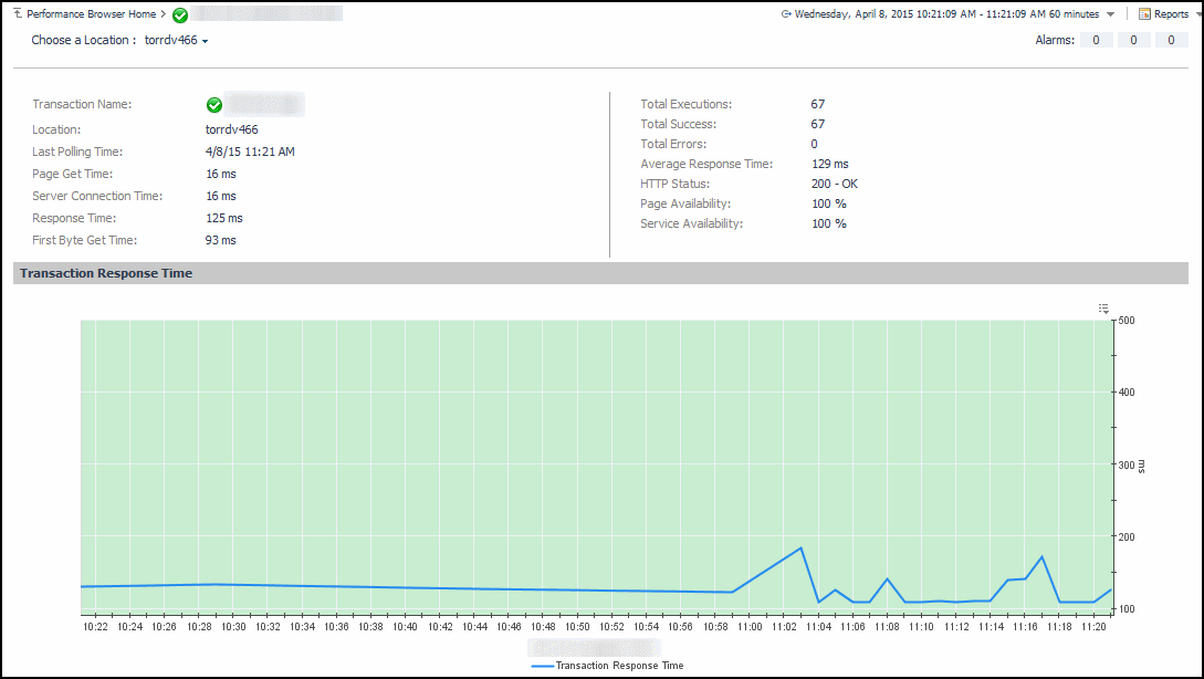 The top part of this view show a number of metrics resulted from monitoring that transaction from the selected location. The bottom part of this view shows a graph indicating the total transaction response times over the selected time range. High peaks in the graph often suggest potential bottlenecks and likely need to be investigated. For complete information about the data appearing on this view, see Transaction at a Selected Location drilldown view.