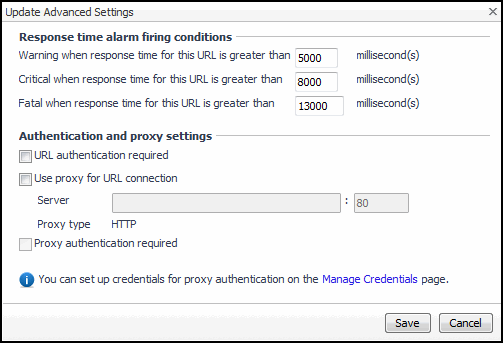 Use proxy for URL connection: Select this check box only if the Web Monitor needs to use a proxy to access the specified URL. Click Manage Credentials to review the existing credentials, and create new ones, as required. For more information, see Configuring credentials to access Web sites requiring user authentication.