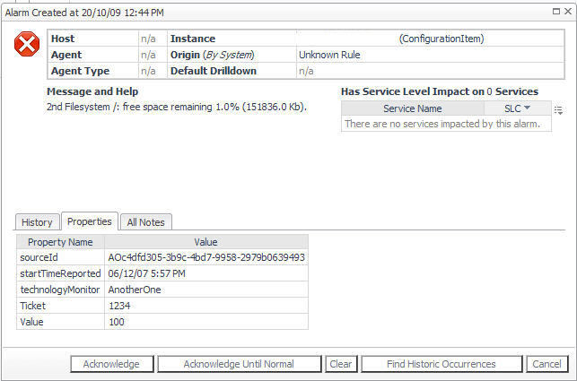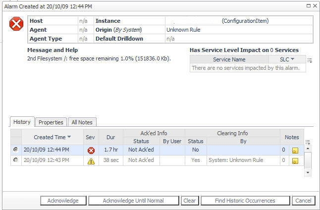 Acknowledge Until Normal — this acknowledges the current alarm and all consecutive alarms that the rule fires on the same instance. This option is available to an outstanding (not yet cleared) alarm only. |