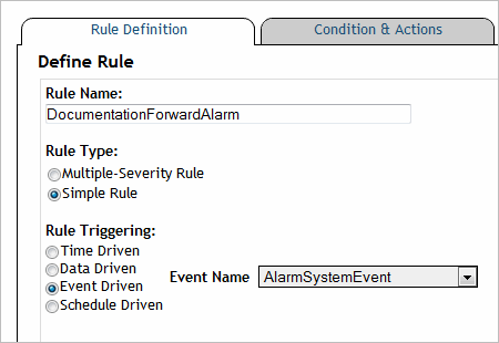 Click to select the Simple Rule option button and the Event Driven option button, then select AlarmSystemEvent from the Event Name drop down. |