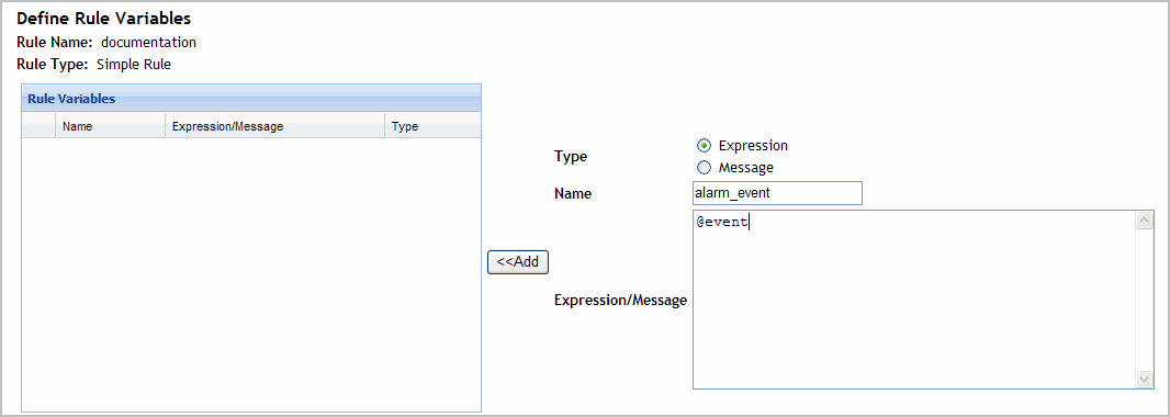 Click the Rule Variables tab to add the rule variables alarm_event and script and set the following: |