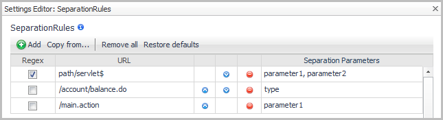 Request separation is the first process that takes place when collecting request metrics. On the Request Sampling tab, you can specify how to separate a request into multiple request types based on the request's parameters and cookies. Separation occurs if any of the parameters in a request match the request separation rules (SeparationRules) for that URL, meaning that a request may be separated based on more than one parameter. SeparationRules are configured in the recording.config property file.