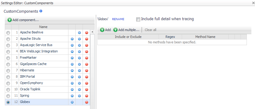 Edit CustomComponents. Specify the name of each component in a method list, either by entering the name or by forming a regular expression that matches the name or pattern. Enter the include element before each item in the list. For example: |