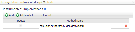 Click in the Method Name box and type the name of the method you want to instrument. For example, in the following image, the getSugar() method is instrumented even if it is detected as a simple method. |
