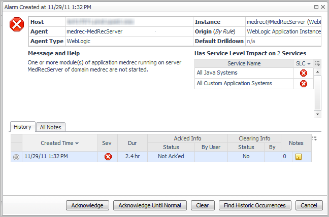 For example, the health of a WebLogic_10 system is poor (), because one server and six applications are unavailable (