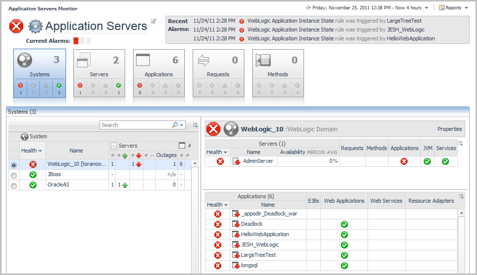 JVM view Method Groups view Request Types view Entity EJBs view Message Driven EJBs view Stateful Session EJBs view Stateless Session EJBs view Deployed Applications view JSPs/Servlets components view Resource Adapters components view Web Applications components view Web Services components view .NET views JBoss Services views Oracle Services views Tomcat Services views WebLogic Services views WebSphere Services views JMX Administration dashboard JMX Explorer dashboard