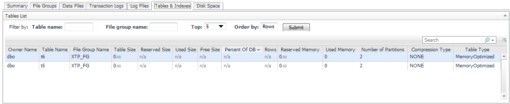 Monitoring tables — using the Tables & Indexes pane, which displays statistics for all tables and indexes in the selected databases (by default, 50 rows are displayed); see Monitoring Tables and Indexes. |