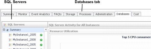 The SQL Server Activity for All Instances view, displayed by clicking Summary under the SQL Servers section, displays summarized data of SQL Server activity for all instances residing on the selected Virtual Machine.