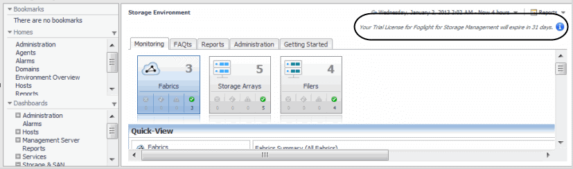 When the Foglight for Storage Management license is expired, a warning message is displayed in the Storage Environment dashboard > Administration tab.