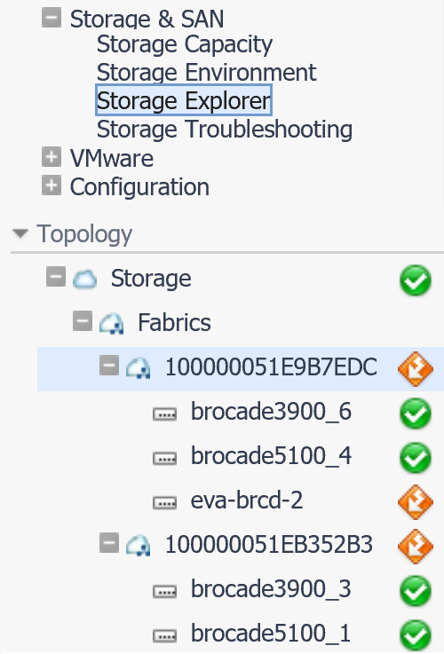 This walkthrough describes how to open the Storage Explorer and select a storage device. If you select a top-level device type node, such as Fabrics, the Storage Environment quick view is displayed. For more information about the quick view, see Monitoring Your Storage Environment.
