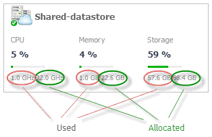 Foglight for VMware populates these tiles using the values stored as metrics collected from monitored organization vDCs.