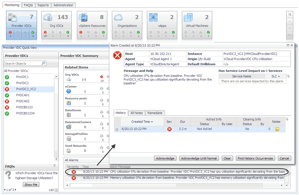 For complete information about alarms in Foglight for vCloud Director, see the Foglight for vCloud Director User Guide.