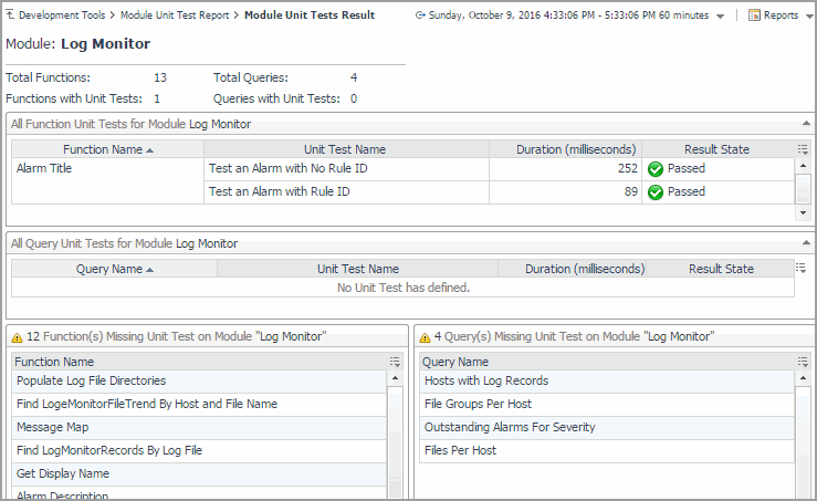 If a module includes function of query unit tests, you can drill down on the unit test details to see the unit test details, whether they passed with success, or failed with errors. This information appears in the Module Unit Tests Result view. Display this view by drilling down on Details in the Unit Tests column on the Module Unit Test Report dashboard.