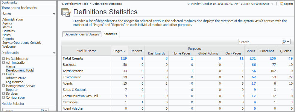 A view can be a page, dashboard, home page, or have a combination of these purposes. For each module, the list shows the numbers of views that are defined as pages, reports, dashboards, home pages, global actions, pages (only), and the total number of views. The ratio of different view purposes in a module can reflect its complexity given its number of home pages, dashboards, and reports. It can also give you an idea on the work required to develop and maintain a module.