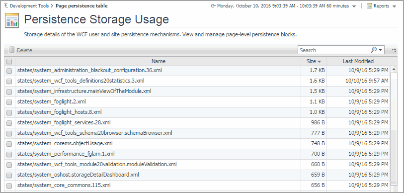 The Persistence Storage Usage dashboard allows you to view the amount of data persisted to the database for each individual dashboard, and the size of these data blocks. For each data block, it shows its size and the date and time it was last modified. You can delete these data blocks to restore the dashboards to their original state, as required. Data blocks are stored in the database. Sorting them by size tells you which data blocks are utilizing highest amounts of database resources which may affect the overall database performance, and delete them, as required, to improve the database performance.