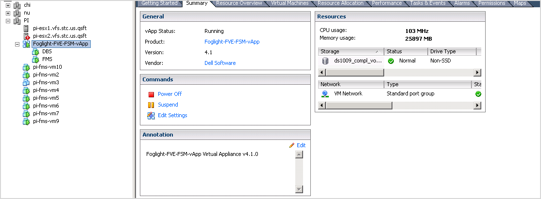 Open vCenter®, select Foglight-FVE-FSM-vApp from the navigation tree, and click Power off vApp.