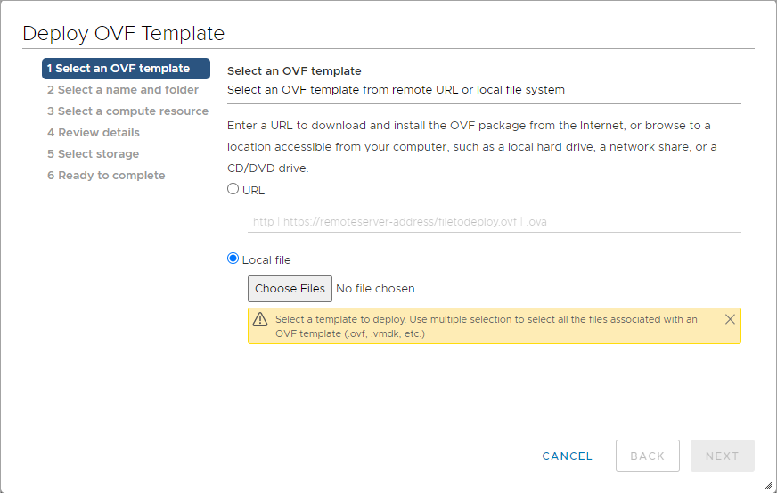 Click Choose Files to navigate to the location of the extracted OVF file and select it. Click Next.