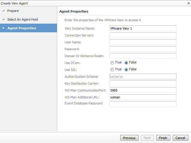 View Instance Name. Name that you want to use for the view instance. This name becomes the name of the agent, and appears in the drop-down list at the top left of the VMware View dashboards. The default name is VMware View x, where x is the next sequential number that is available. |