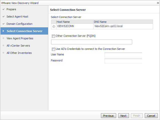 Select the Connection Server that you want to monitor in the agent instance. When you select a Connection Server, the AD’s credential check box is automatically selected, and the User Name and Password boxes are pre-filled based on the user name and password that you entered in Step 4. The Other Connection Server (FQDN) text box is pre-filled with the DNS name. Modify these entries as required. |