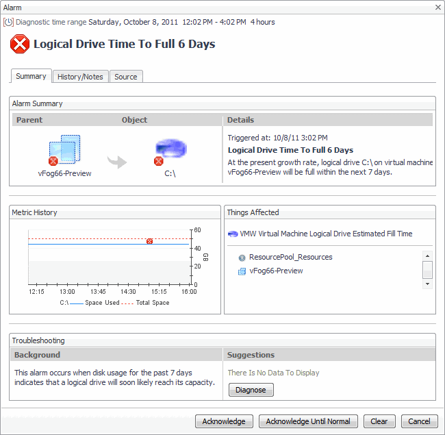 Alarm Message, Severity, or Time. Displays the Alarm dialog box, showing additional information about the alarm. For more information about alarms in Foglight, see the Foglight User Help.