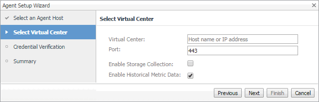 If you want to import historical data, select the Enable Historical Metric Data check box. This data is not immediately available as it takes some time to collect it. This process can import data collected over 30 days or less, depending on the amount of data available in the Virtual Center. Selecting this option allows you to explore VMware metrics as soon as the data is imported, instead for waiting for the agent to collect some data from the Virtual Center.