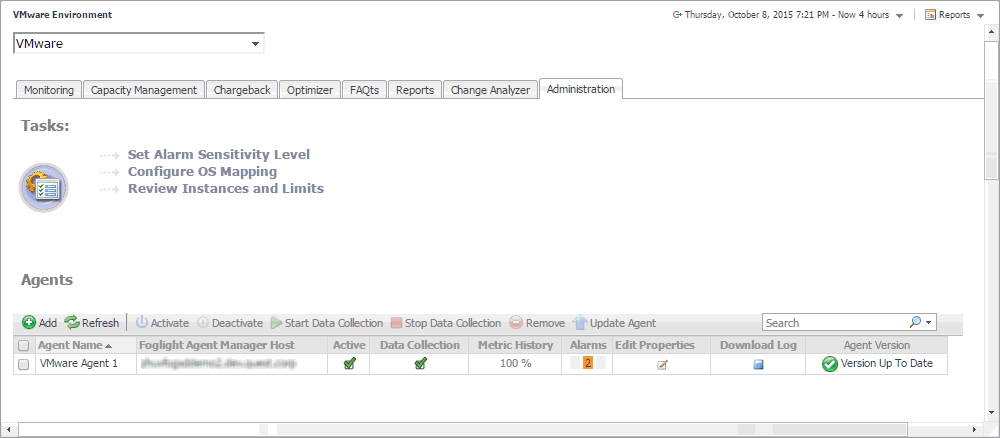 Foglight for VMware uses the VMware Performance Agent to collect information from monitored environments. Creating a VMware Performance Agent instance creates the agent process on the Agent Manager host. Activating the VMware Performance Agent starts that agent process, while starting an agent instance’s data collection enables the agent to start collecting data from the monitored Virtual Center and to send it to Foglight for VMware.