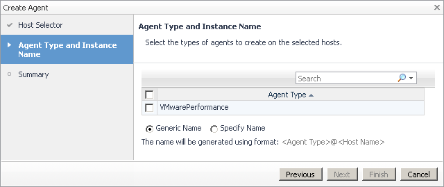 IMPORTANT: If the VMwarePerformance agent type is not listed, you likely need to deploy the VMware Performance Agent package to that host. For more information, see Deploying VMware Performance Agent packages to monitored hosts .