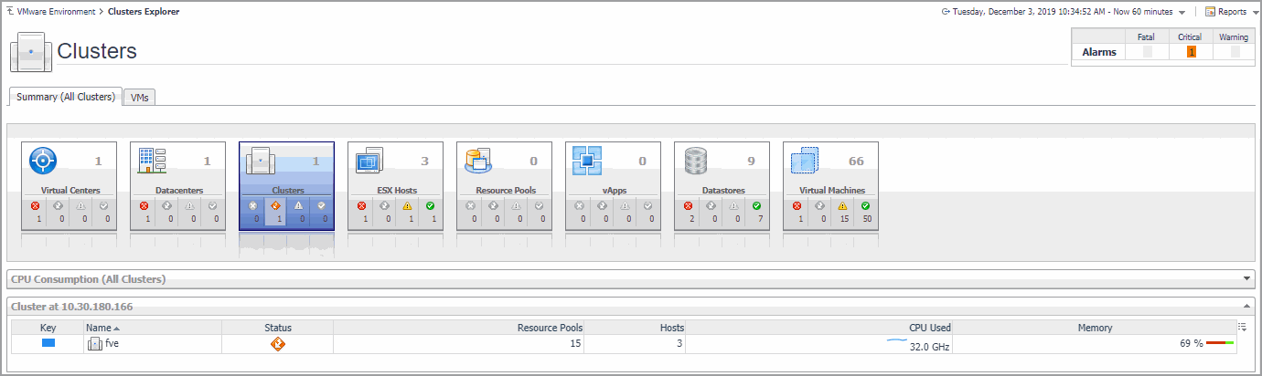 The VMware Explorer’s Virtual Environment view displays a high-level overview of your virtual environment. The view has a tile for each object type: Clusters, Servers, and Virtual Machines. Each tile shows how many of the corresponding object instances there are in your virtual infrastructure, as well as the count of objects of that type in each of the alarm states (Normal, Warning, Critical, Fatal).