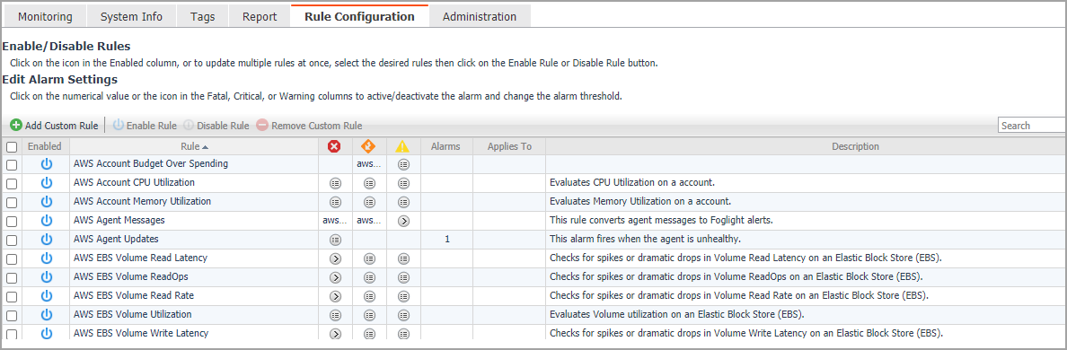 The Rule Configuration dashboard shows a list of existing rules and a set of rule management commands at the top of the list. Use the Add Custom Rule button to create a new rule as needed.