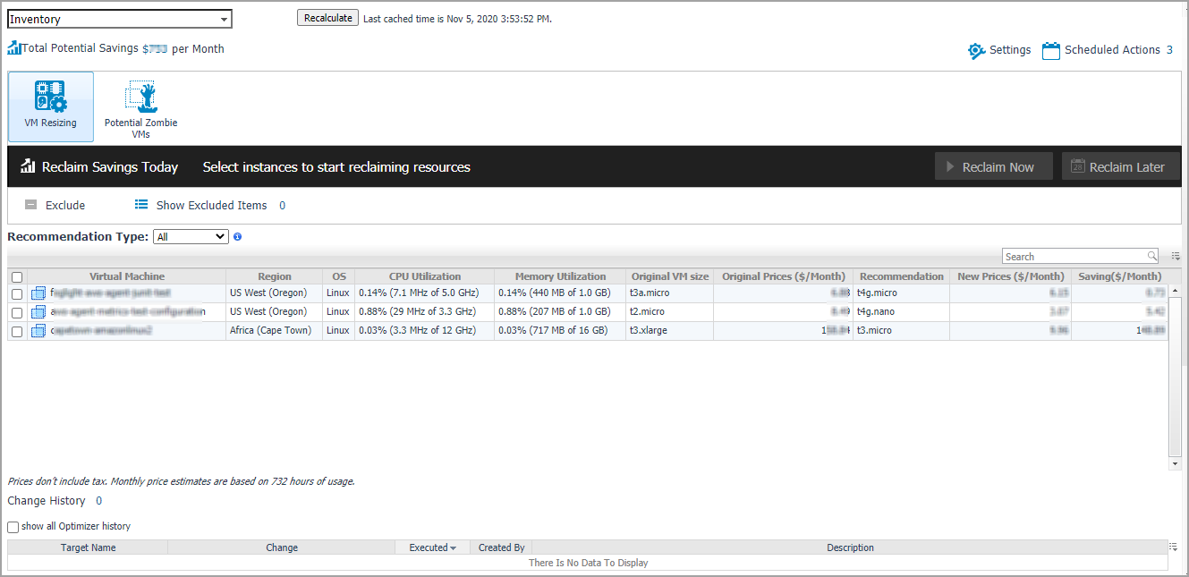 Reclaiming Savings bar. The Reclaiming Savings bar enables the system administrator to select instances from the list and review the resources that can be reclaimed.