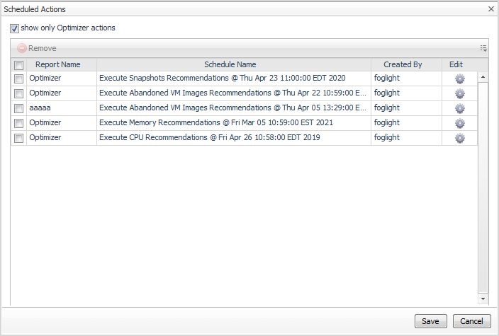 The Scheduled Actions dialog shows the list of operations scheduled to be run at a particular time in the future, and allows you to edit or remove any scheduled actions. To view only the actions specific to Foglight Resource Optimizer, select the “show only Optimizer actions” checkbox. When the checkbox is not selected, the dialog shows all actions scheduled for your virtual environment.