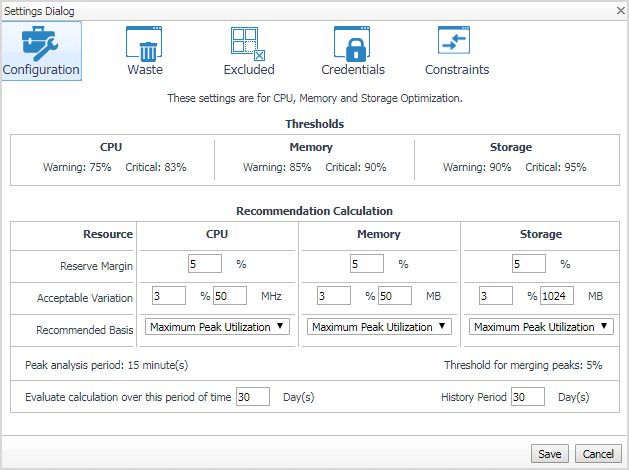 The Waste tab allows you to configure the settings for determining resources wasted in your environment. These include powered-off VMs, unused template images, snapshots, and potential zombie VMs: