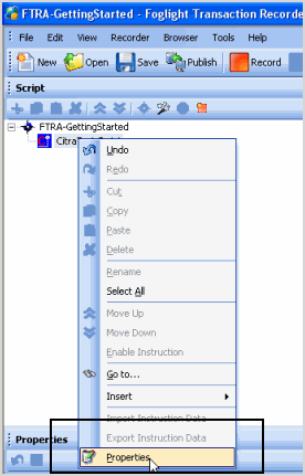 You must point the GettingStarted.exe file used in the sample script to the Foglight Transaction Recorder. Right-click the CitraTest Script transaction, and select Properties. |