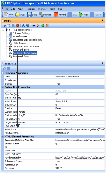This script builds upon the FTR-Random Input example in the previous procedure. The first input is selected randomly from a list. A “Value Script”, viewed in Instruction Properties, saves the random number generated to the clipboard.