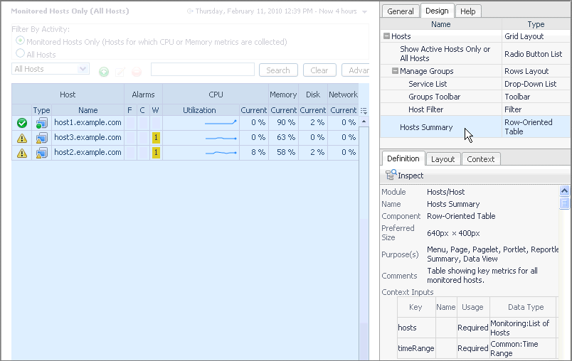 In the above image, the Row-Oriented Table contained in the Grid Layout is selected. The portion of the grid that contains the table is highlighted, and Definition tab displays the same information that is found in Configuration > Definitions for that component. There is an Inspect button directly underneath the Definition tab. If it is selected the Definitions area opens, permitting you to edit the component’s properties.
