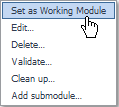 Set as Working Module: Sets the module as the working module. This module becomes the active module when you navigate to the Definitions area.
