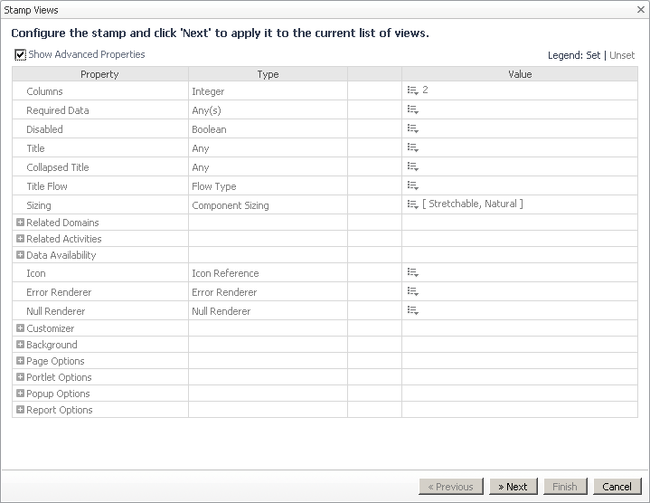 To edit a property, in the Stamp Views wizard, click in the Value column, and proceed with making the edits, as required.
