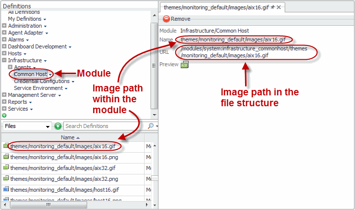 For example, you can have two different themes for two monitoring modes, Application and Monitoring. This requires a base theme directory, images (located under <module>/themes/images). If you need a separate set of images for the Application and Monitoring themes, you need to create image directories for those themes: <module>/themes/monitoring_default/images and <module>/themes/application_default/images. Theme-specific images are optional and only required if a theme is different from the base theme.