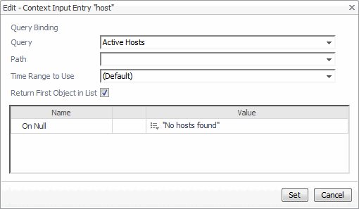 In the Edit - Context Input Entry “host” dialog box that appears, click the Query box, and choose My Queries > Active Hosts from the list that appears.