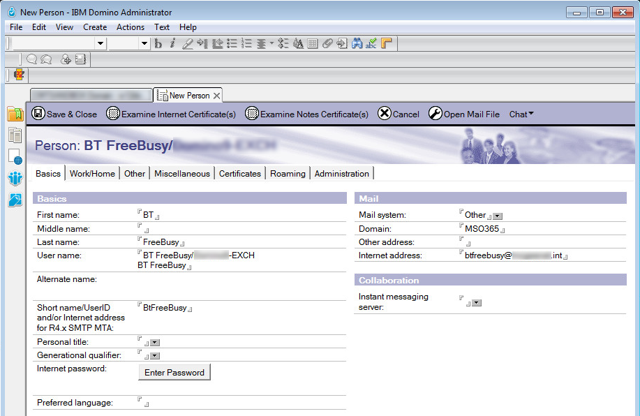 Create a new Person Document using the field values shown in the table below. This Person Document does not need a Notes ID or mailbox, so it is not necessary to create it via the normal Notes registration process. Save and close the document when complete.