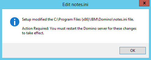 4. If you selected Let Setup modify the notes.ini, click OK in the resulting dialog box; changes to the Notes.ini file will take effect when the Domino server is restarted:
