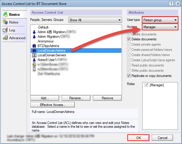 Change the user types to Person group for LocalDomainAdmins as shown below; additionally, grant the LocalDomainAdmins [Manager] role to view additional configuration options in the BTStore database: