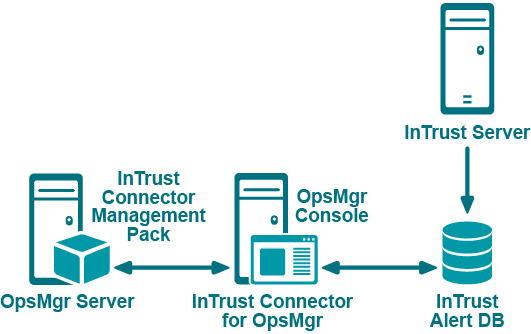 InTrust Connector for Operations Manager allows you to forward alerts stored in the InTrust Alert database to Operations Manager so that personnel in charge can view and resolve the alerts using the Operations Manager user interface. The workflow is implemented through InTrust, InTrust Connector for Operations Manager, and Operations Manager.