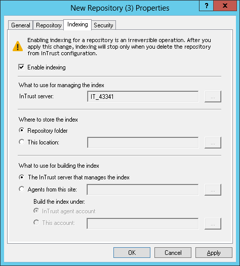 If a repository is created in InTrust Deployment Manager, indexing is enabled automatically for it, but if it is created in InTrust Manager, indexing is disabled by default. To configure indexing options for an existing repository, open its properties in InTrust Manager and go to the Indexing tab.