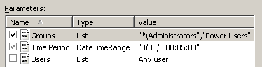 Notice that the check box next to the Users parameter is cleared, and the default value is used for the parameter. The value itself is not shown, but replaced with a description. The Groups parameter also has a default value, but it is not used in this case.