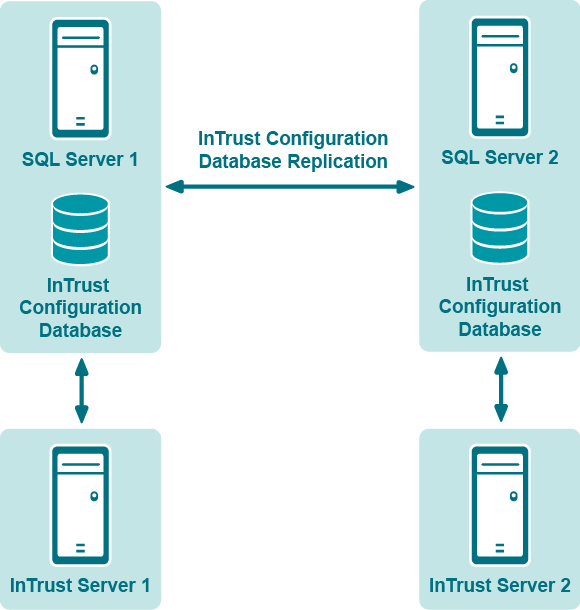 The configuration shown below has two InTrust Servers and two identical SQL Server computers with replicas of the InTrust configuration database that are synchronized to maintain consistency.